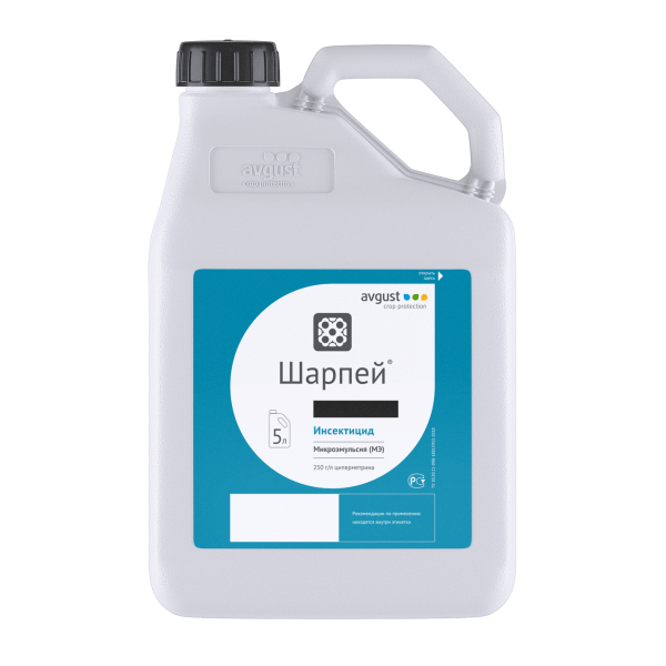 Шарпей обладает быстрым контактно-кишечным действием, поражает нервную систему вредных насекомых. В течение 10 — 15 минут после обработки они перестают передвигаться, а затем гибнут в результате общего паралича всех органов. Кроме того, препарат способен нарушать откладку яиц у имаго и питание у личинок.